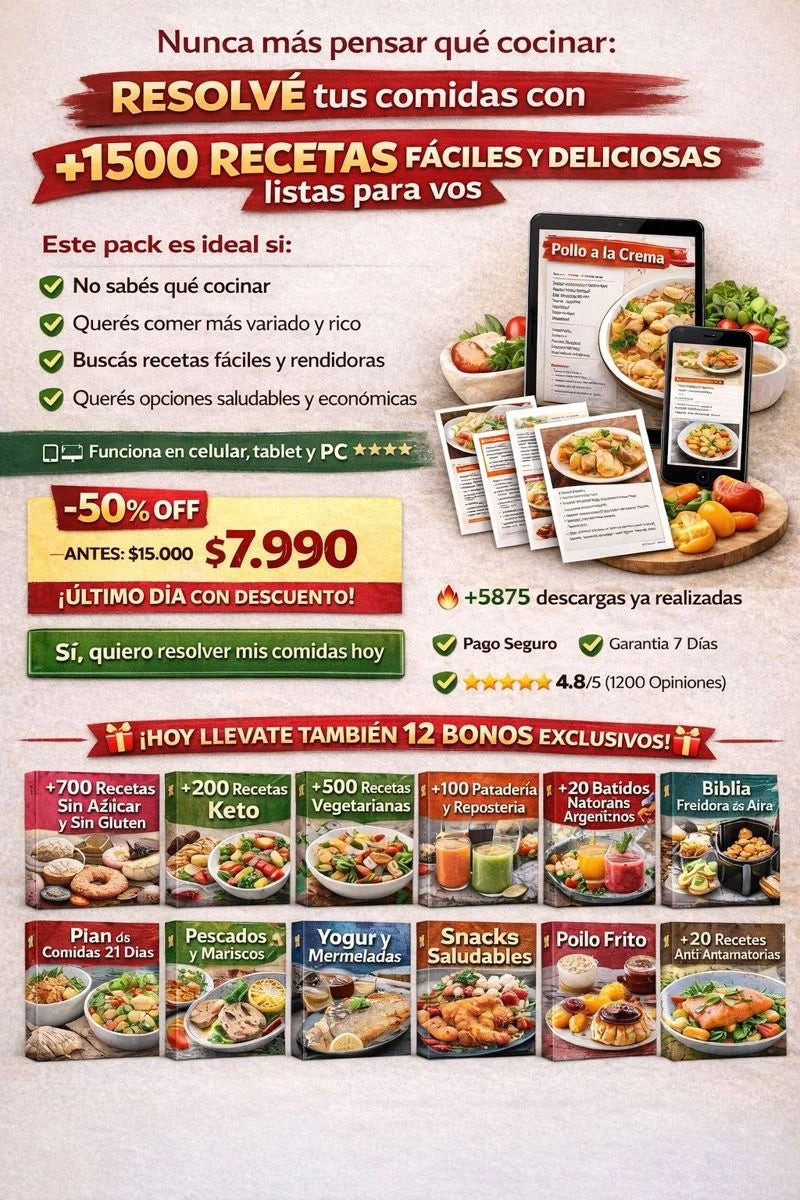 Recibirás el recetario principal con +1500 recetas (desayunos, almuerzos, cenas, snacks y postres), más todos los bonos exclusivos. Es un archivo digital PDF de alta calidad.